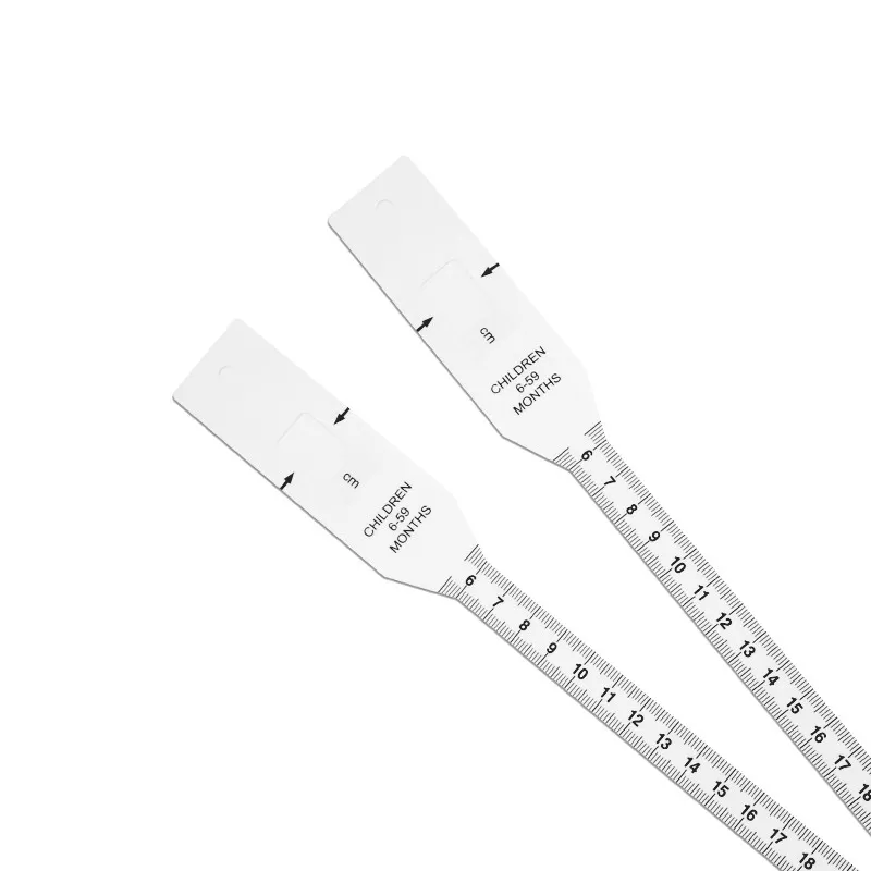 Mid-Upper Arm Circumference (MUAC) Tape Measure and head circumference measuring tape are both made of PP plastic. Muac measuring tape is used to measure the circumference of the mid upper arm. The measurement circumference of the children's version is usually 26 cm, and the measurement circumference of the adult version is usually 56 cm. The measurement circumference of the head circumference tape measure is usually 60 cm and 70 cm.